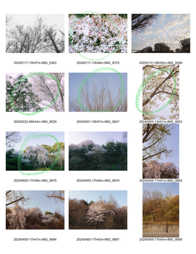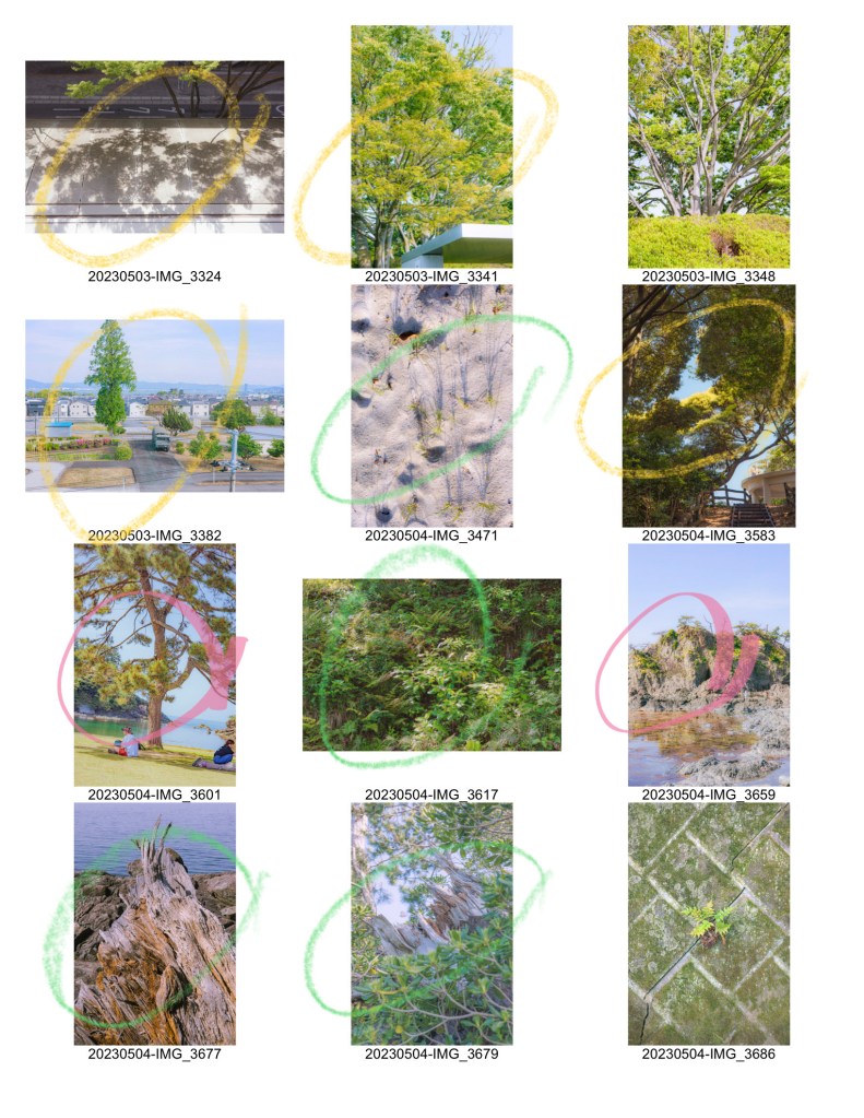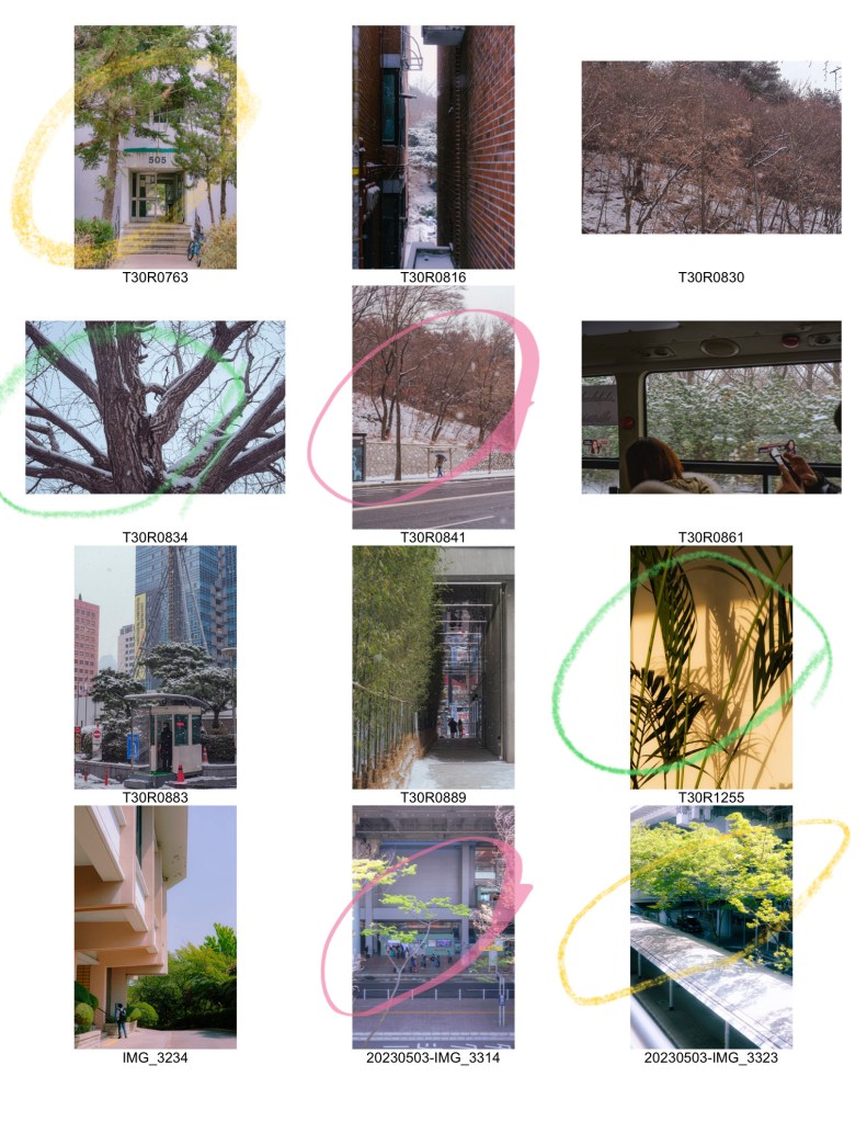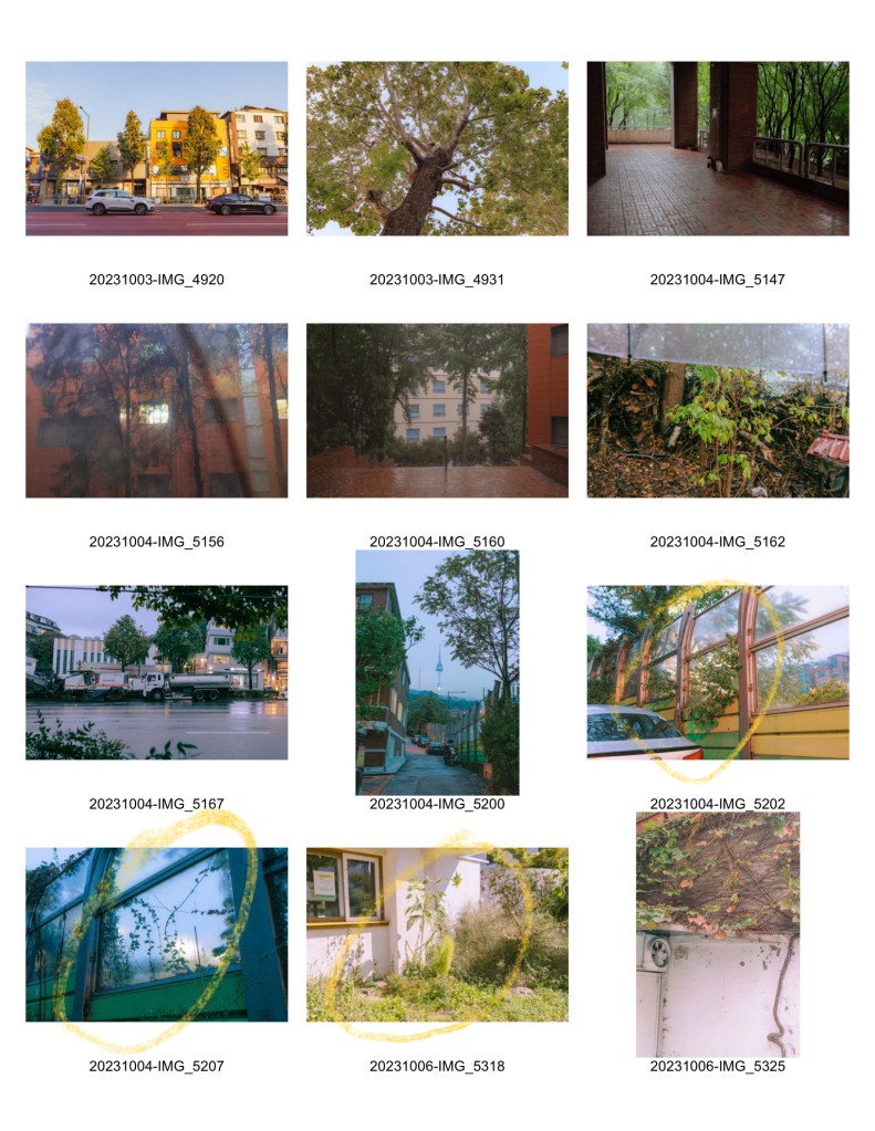 출력해서 실제로 보면 좀더 괜찮을까? 사진이 대체로 평면적이고 입체감이 떨어져서 힘든 것 같기도 하다. 또 의식있는 촬영 없이, 있는 사진 가운데에 식물과 초록의 주제에 맞는 사진을 고른다는 게 어려웠다.