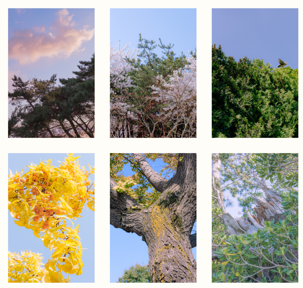 초록딱지 붙인 사진을 분류해보니 위와 같은 4가지로 적당히 갈라볼 수 있었고 그 중에서도 나무단독을 하늘배경으로 ‘몸을 젖히며’ 찍은 사진들이 마음에 들어서 우선 갈무리한다.