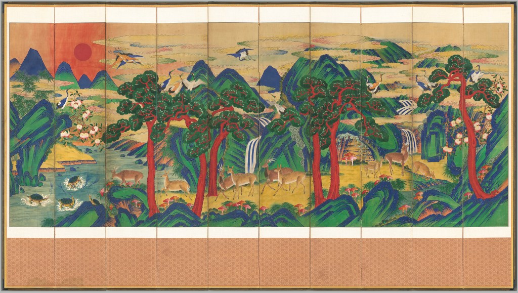 조선시대 후기의 십장생도(링크0)(링크1)(링크2)나 한궁도(링크)의 병풍을 읽는 일과 비슷하다.
