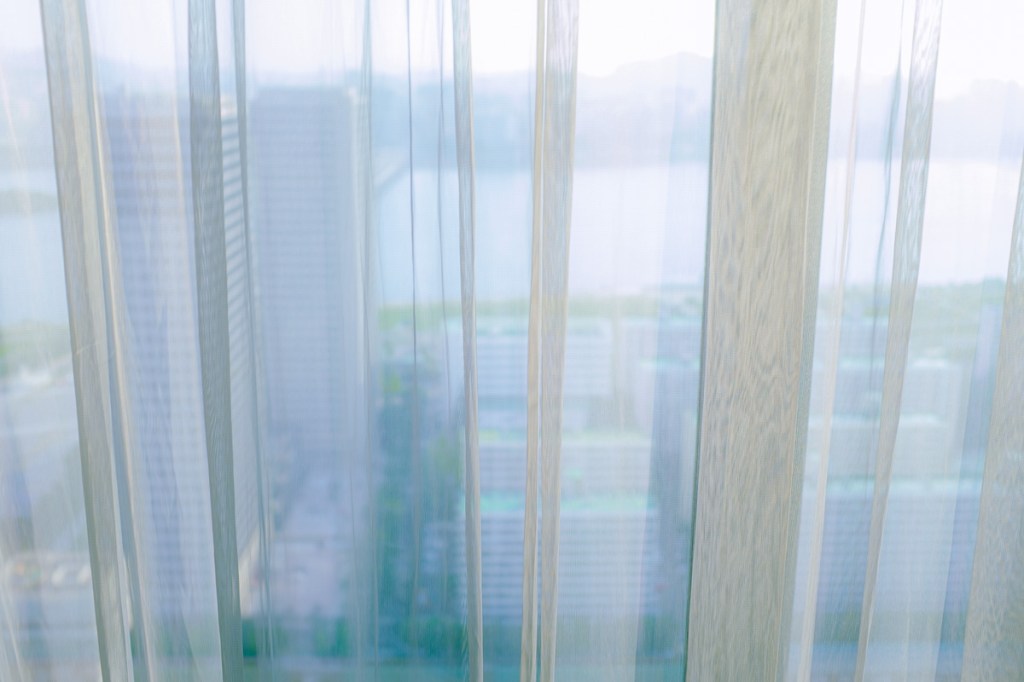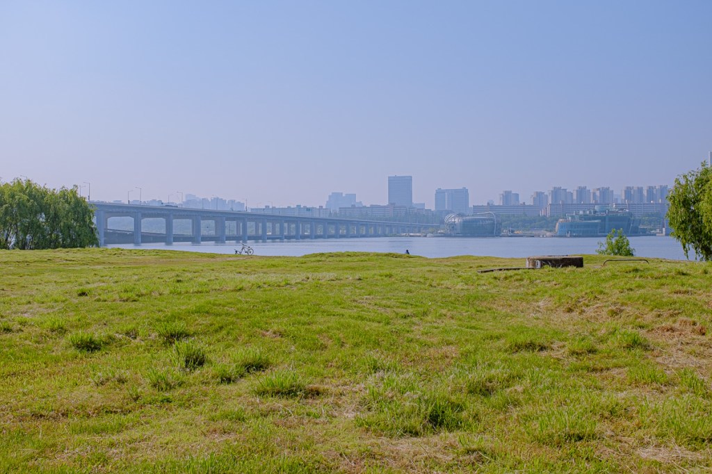 노을, 한낮의 부드러운 빛에 반짝이는 강, 여의도 빌딩숲, 여의도 커튼 뒤에서.