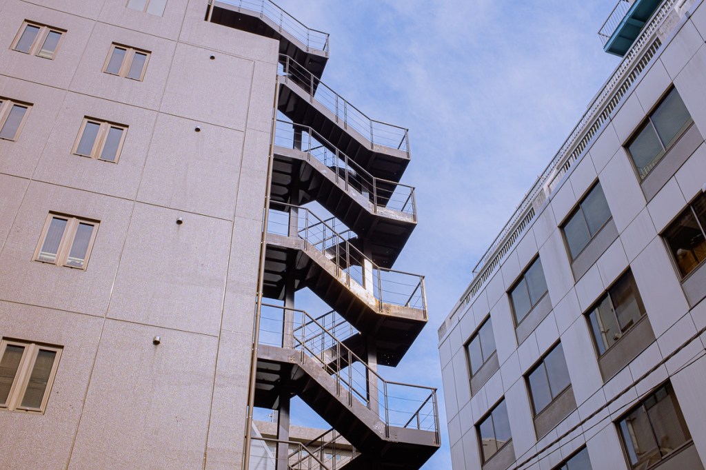 정렬된 높은 건물 사이로 들어와 창문을 비추며 땅에 닿는 빛들.