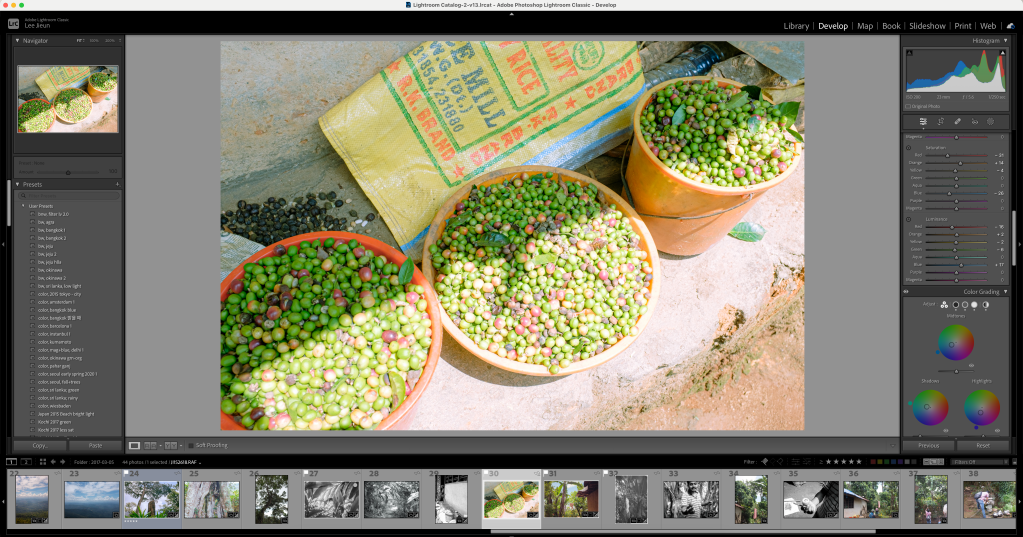 왼쪽은 내가 만든 인화 프로필이고, 가운데는 대상 사진, 오른쪽은 사진마다의 세부조정 (빛, 색, 세부표현). 아래는 데이터 목록. 빛, 색, 세부표현 세가지를 어떻게 표현할지 왔다갔다하며 조정한다.