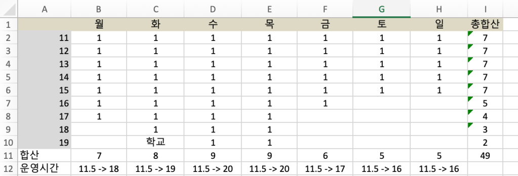 - 일하는 사람이 내가 아니라고 상정하고 수요에 맞춰서 ‘욕심껏’ 운영시간을 잡는 관점이 하나 있고.. (11.5 시에 시작은 하지만 그 앞에 운동을 가고, 그 뒤로는 학교를 간다) — 주간 총 영업시간 49시간